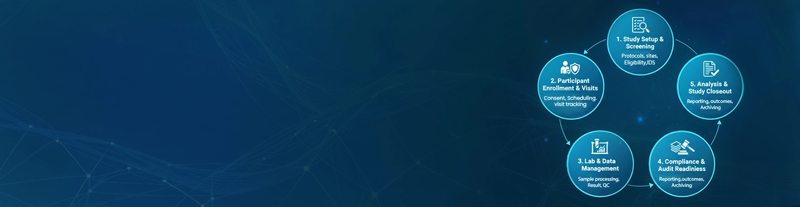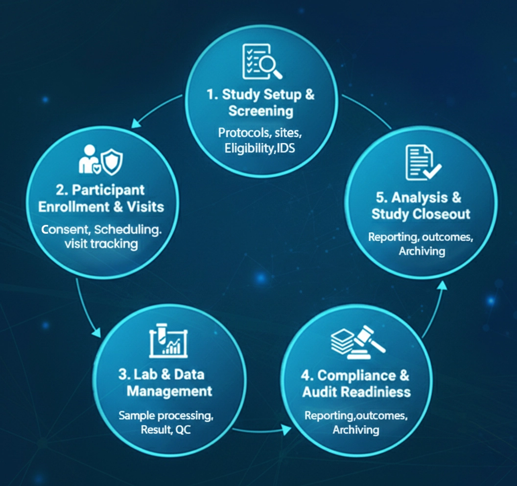 From screening to study closeout:- Our CTMS helps research teams reduce manual tracking, &higlighttxt;ensure audit readiness, and maintain full lifecycle control&:higlighttxt; by unifying trial management with robust LIMS architecture.